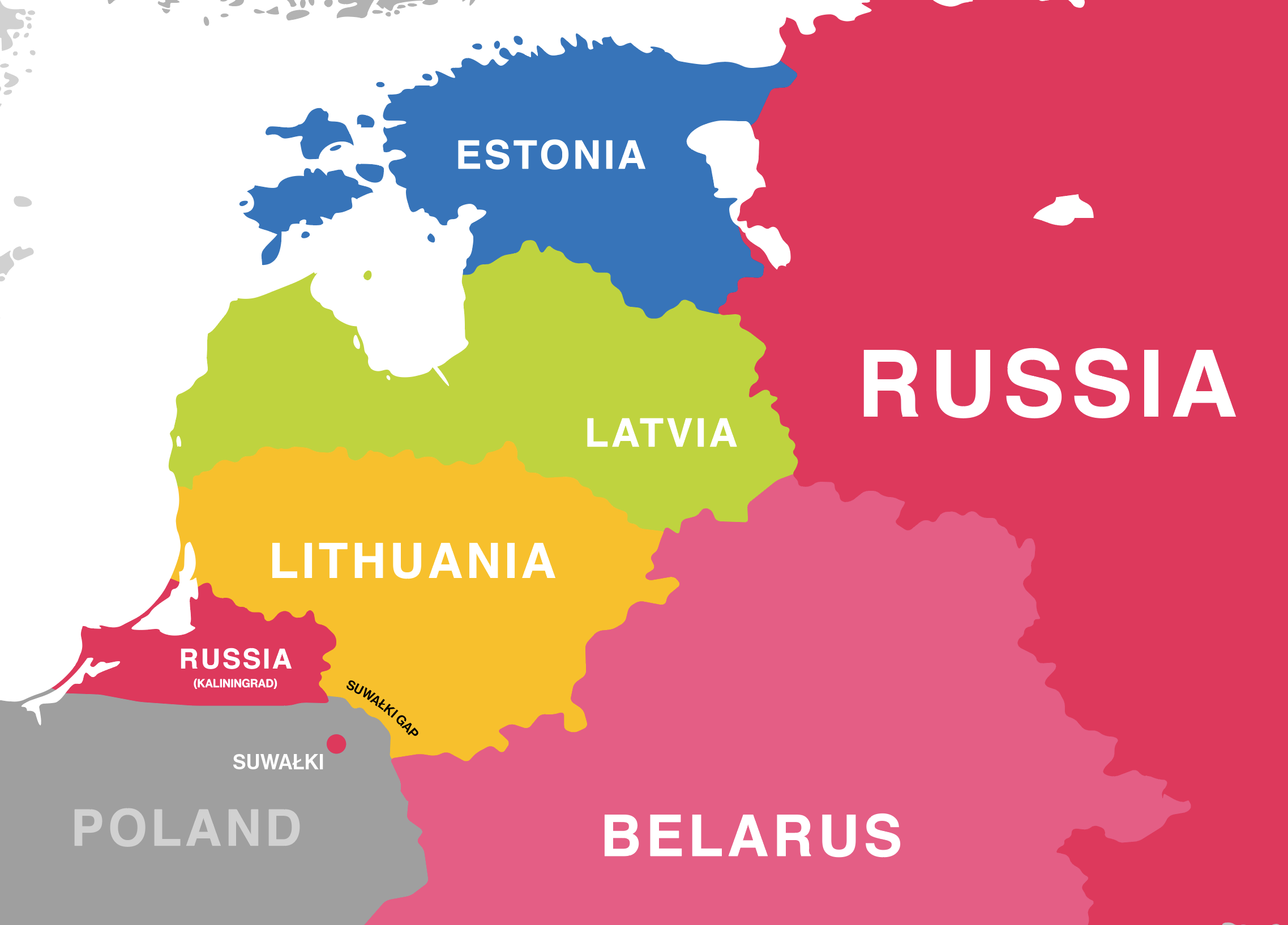 Estonia and Latvia have sizeable Russian minorities of around 25% each. And while it's just 5% in Lithuania, that country of less than 3 million people is what Moscow needs to link its isolated Kaliningrad oblast to the rest of the motherland via Belarus (which is likely to be formally annexed at some point) – closing the Suwałki Gap.