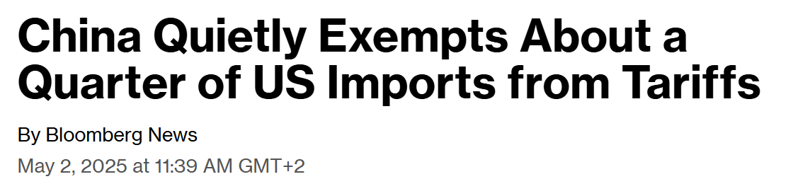 However, soon enough (April 26) it was revealed that the communist authorities started quietly exempting critical goods from their own tariffs to resume important imports from the USA.