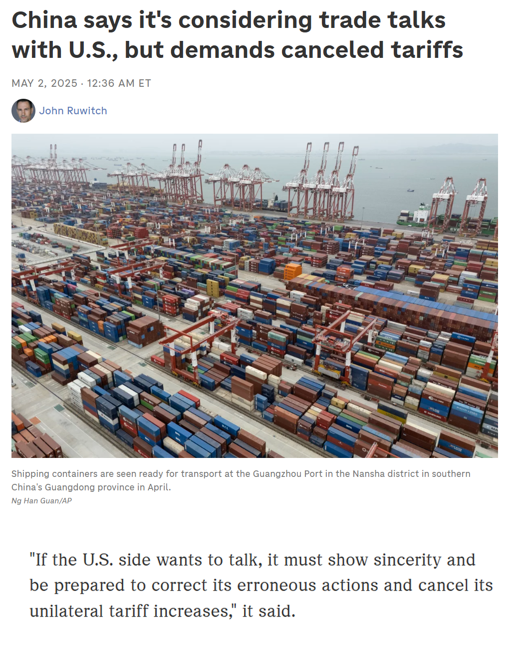 At first Beijing appeared to have dug in, demanding that Washington removes the tariffs before any talks could commence (April 24).