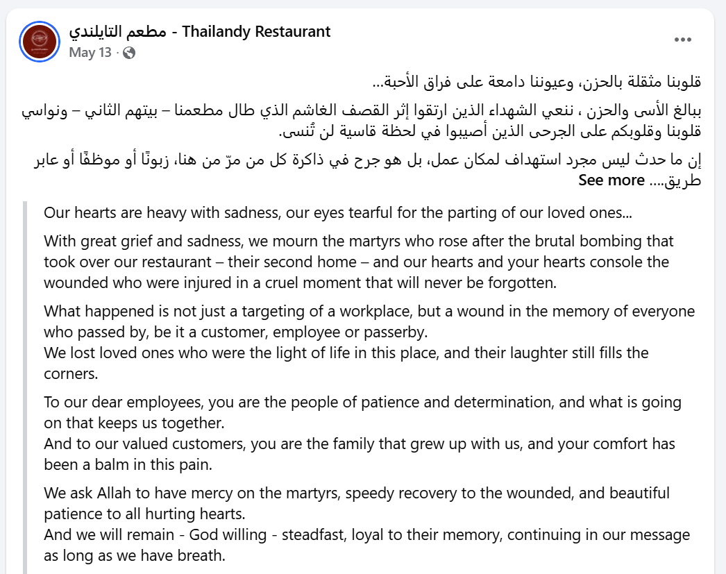 The restaurant shared a post following the attack, lamenting the victims and damage:
