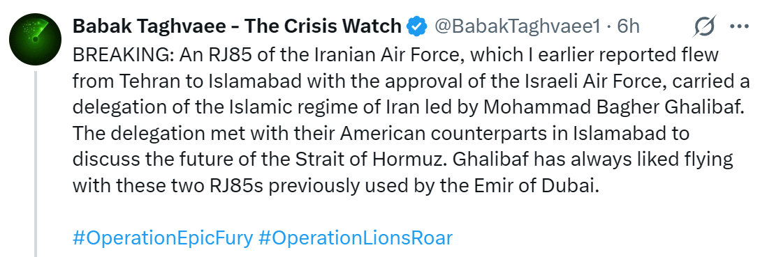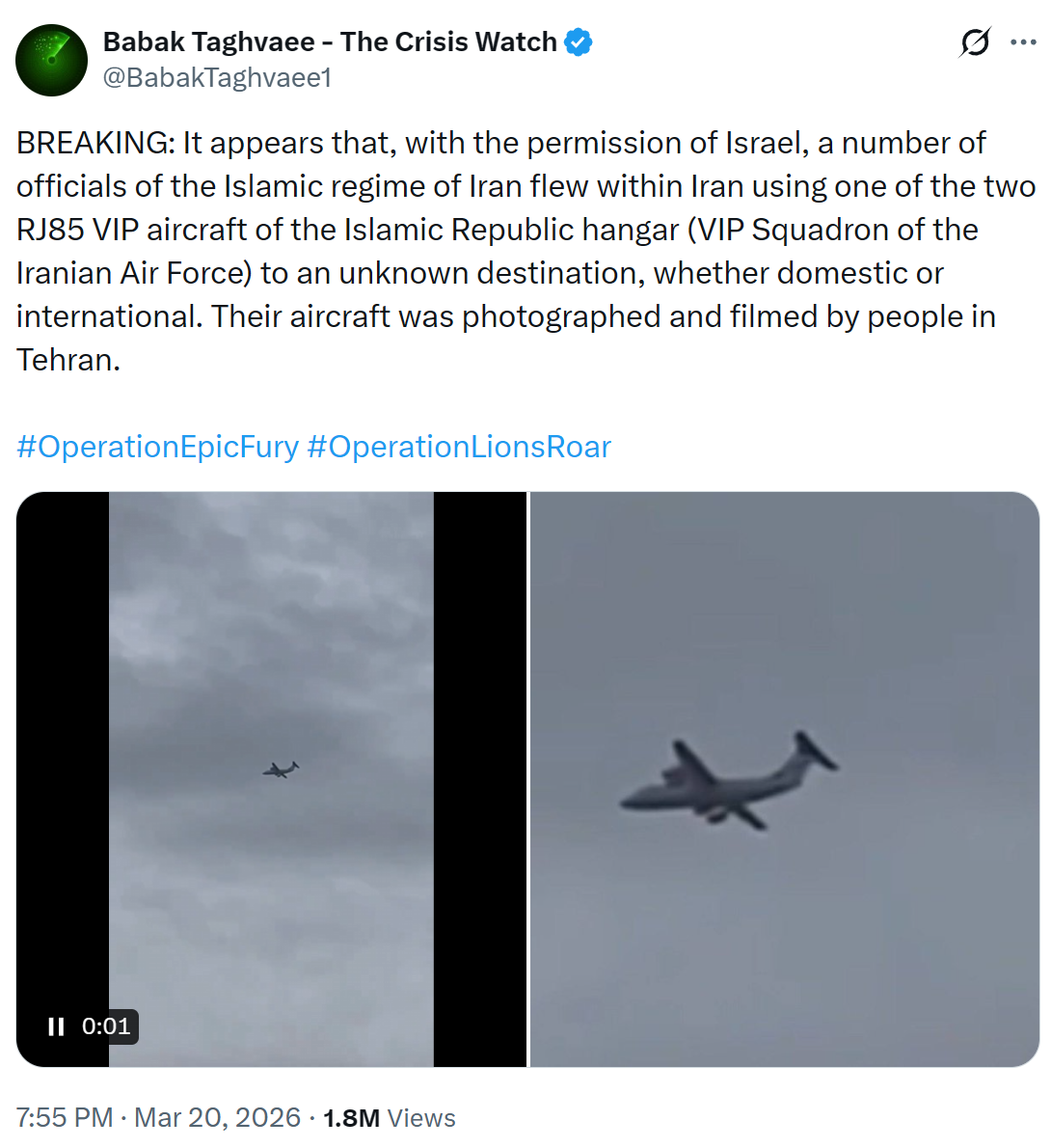 Earlier yesterday he reported an RJ85 air craft belonging to the regime taking off from Tehran – which could not have happened without Israeli and American permission, given the ongoing strikes.