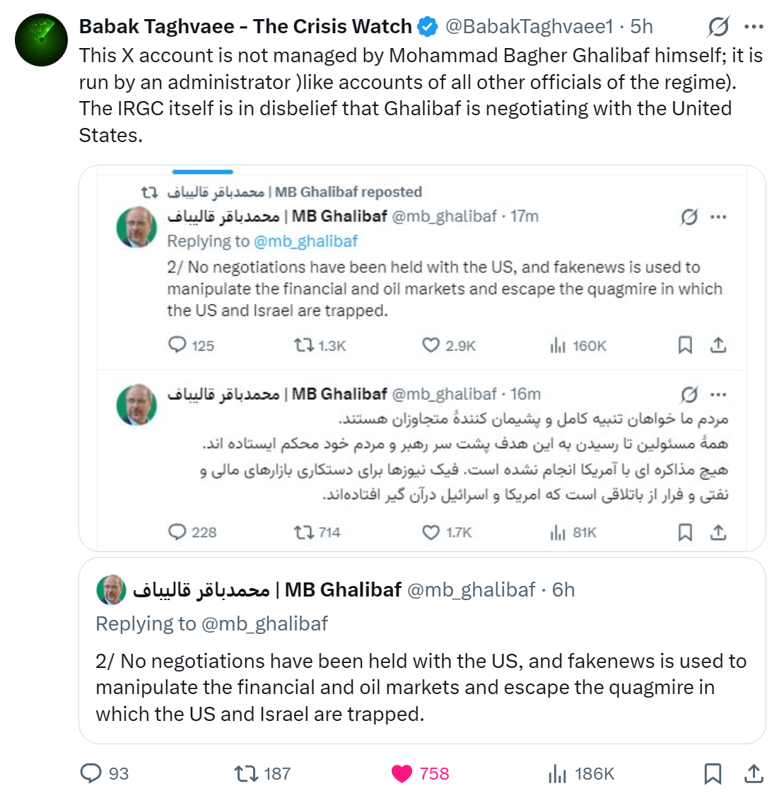 All of this put together suggests an ongoing strife in the Iranian leadership, against the hardliners from IRGC, who appear to have seized most control, installed Mojtaba Khamenei as a puppet Supreme Leader (who hasn't been seen or heard since the war started) and are now desperate to stay in charge, while more pragmatic politicians are seeking a diplomatic path.