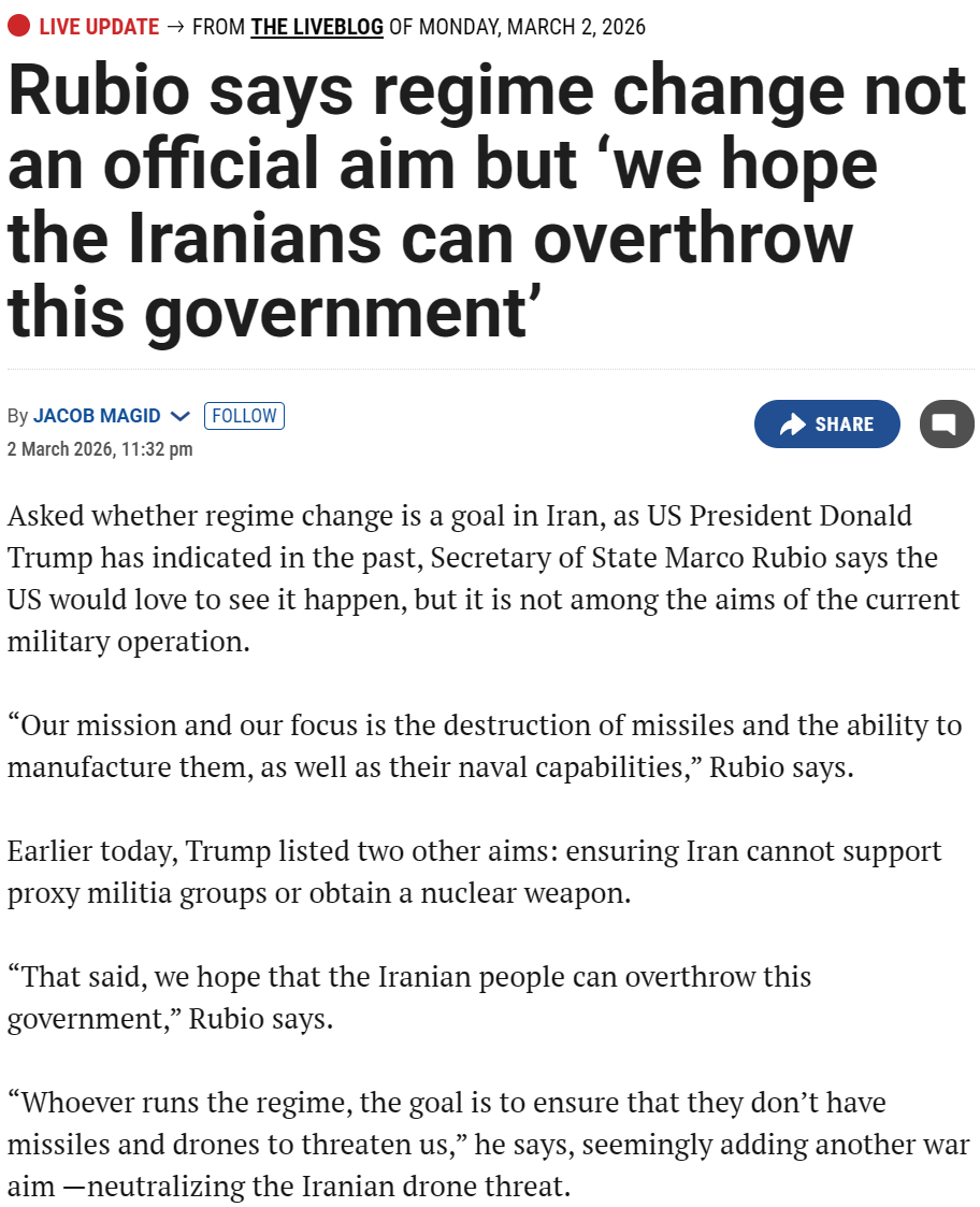 It was communicated in the early days of American-Israeli airstrikes by the US Secretary of State, Marco Rubio, who said that regime change was welcome, of course, but is not a stated goal of the operation.